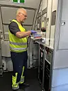 Inne i kabinen skjer det også mye på kort tid. Øystein Lerdalen og teamet hans fra Cabin Equipment fyller opp utstyr, tømmer søppel og gjør klart før boarding starter.
